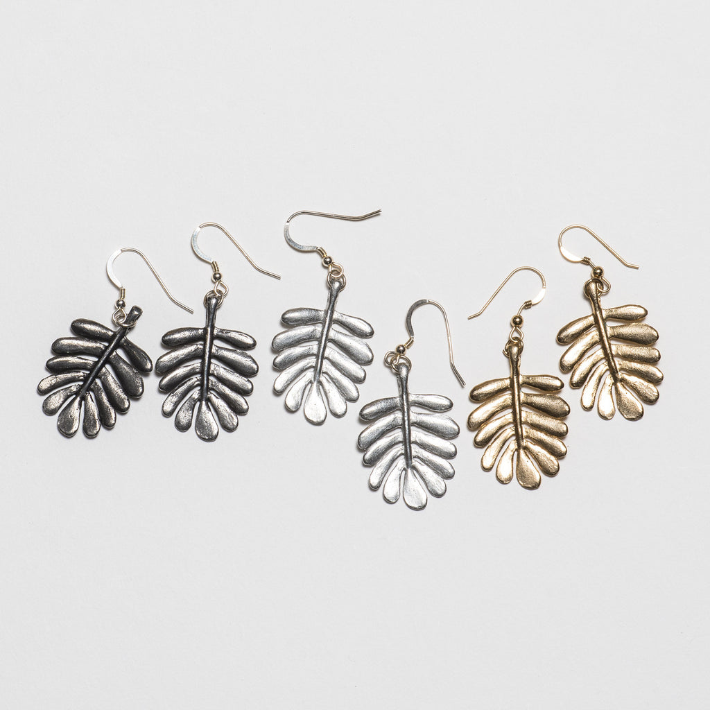 The 1 x 1 inch hand sculpted Yarrow leaf pendants are spin cast using time honored old world techniqies and finished in oxidized silver. They hang from sterling silver ball and coil French hook ear wires.